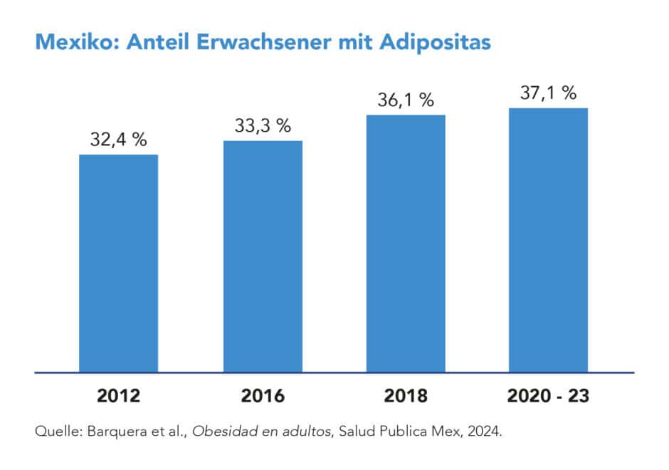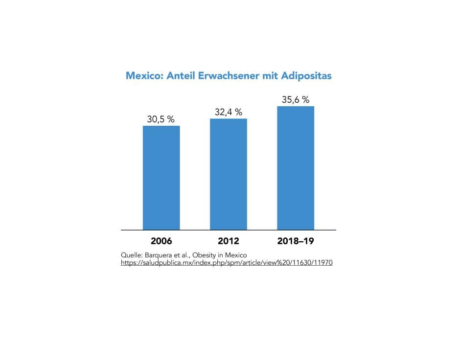 Mexiko hat Anfang 2014 eine Steuer auf zuckerhaltige Softdrinks eingeführt, deren Ziel es sein soll, das Verbraucherverhalten zu ändern. Die Zahlen zeigen, dass die Anzahl der Menschen mit Adipositas nicht nur weiter ansteigt (2006 – 2018). Der Anstieg hat sich seit Einführung der Zuckersteuer auch nicht verlangsamt (Abb. 1, siehe Barquera et al., Obesity in Mexico, prevalence and trends in adults, 2020).