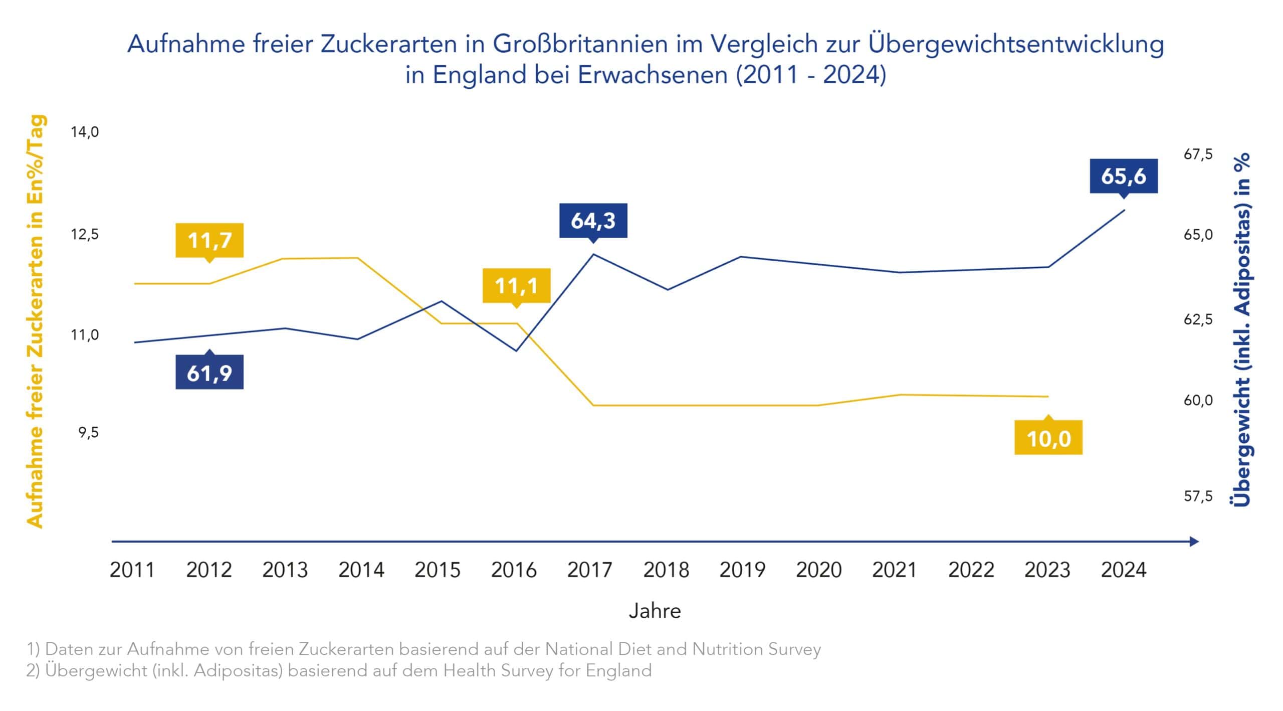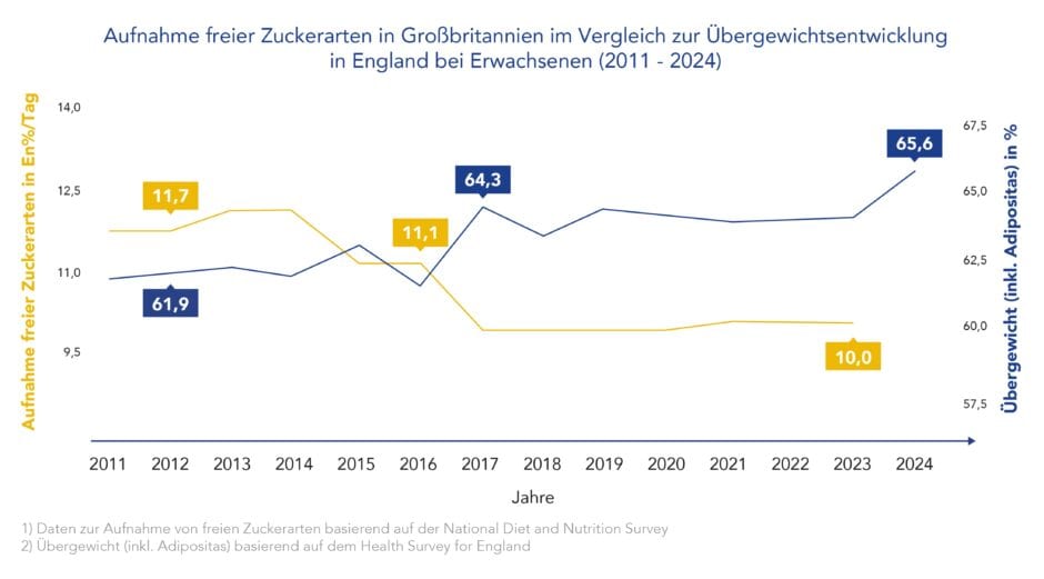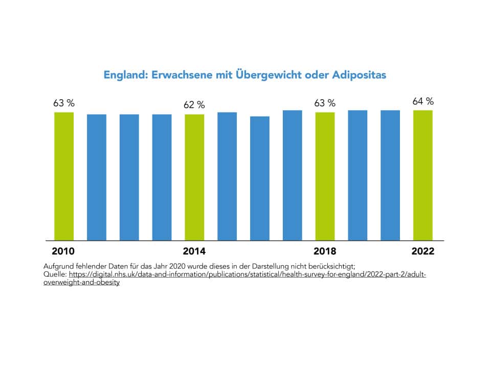 Es stimmt zwar, dass heute deutlich weniger Zucker aus Erfrischungsgetränken konsumiert wird, auch der Zuckerabsatz durch Softdrinks ist zurückgegangen. Aber Ziel der Maßnahme war es, die Fettleibigkeit zu verringern. Und das wurde nicht erreicht. Im Gegenteil: Laut dem National Health Service England (NHS) steigt die Übergewichtrate bei Erwachsenen und Kindern ab der sechsten Klasse seit 2008 an.