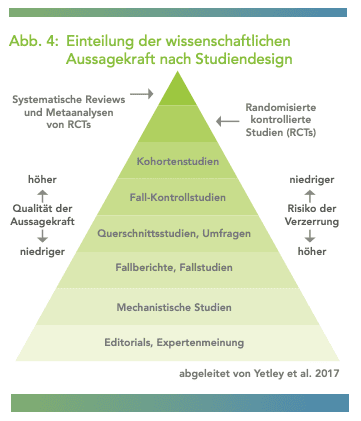 Angesichts der Vielzahl der Studien, die heute publiziert werden, ist es oftmals schwierig zu erkennen, welche davon tatsächlich wissenschaftlich fundiert und glaubwürdig sind. Abbildung 4 zeigt die sogenannte Evidenzpyramide (7), die die Aussagekraft verschiedener Studientypen veranschaulicht. Am unteren Ende stehen Expertenmeinungen und sogenannte Beobachtungsstudien – dazu zählen Fallstudien, Querschnittstudien, Fall-Kontrollstudien und Kohortenstudien. Diese sind wichtig, um erste Hypothesen zu entwickeln. Ihre Aussagekraft ist jedoch begrenzt, da sie keine Ursache-Wirkungs-Beziehung (Kausalität) nachweisen können. Bei Beobachtungsstudien können nur statistische